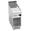 Piano di lavoro e pannelli frontali in acciaio inox AISI 304. Bruciatori tubolari a fiamma di grande superficie per una maggiore uniformità di distribuzione del calore. Valvola a comando termostatico 60 °C – 300 °C per una regolazione precisa e sicura. Fiamma pilota e valvola di sicurezza a termocoppia. Accensione piezoelettrica con protezione in gomma. Piastra liscia ad alto spessore a tutta misura con paraspruzzi a filo. Piastra di cottura bicomponente che combina una lastra di acciaio, per ottimizzare l’uniformità, ad un rivestimento superiore in acciaio inox AISI 316 con finitura lucida, per un’ottima pulizia e un basso livello di irraggiamento, con conseguente maggior confort per l’operatore. Due zone con comandi separati per una regolazione della temperatura indipendente ed ottimale. Particolarmente indicato per cotture delicate. Superficie di cottura leggermente inclinata con foro di scarico di grandi dimensioni e convogliatore in apposito contenitore.