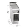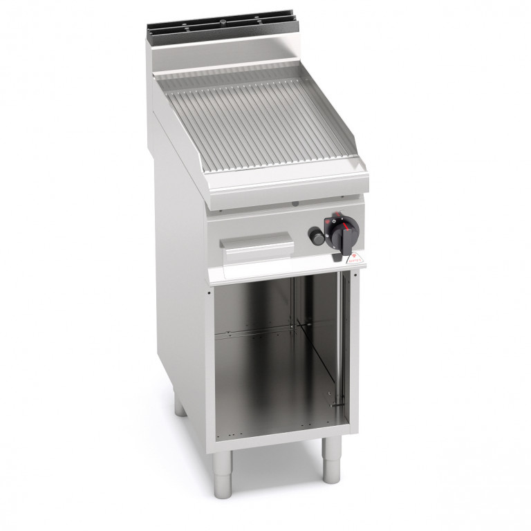 Piano di lavoro e pannelli frontali in acciaio inox AISI 304. Bruciatori tubolari a fiamma auto stabilizzata di grande superficie per una maggiore uniformità di distribuzione del calore. Regolazione della potenza erogata tramite rubinetto a funzionamento continuo. Fiamma pilota e valvola di sicurezza a termocoppia. Accensione piezoelettrica con protezione in silicone. Temperatura massima oltre i 300°C. Piastra RIGATA in acciaio satinato con paraspruzzi a filo. Superficie di cottura leggermente inclinata con foro di scarico di grandi dimensioni e convogliatore in apposito contenitore a tenuta di liquidi. Piedini regolabili (versione con mobile).