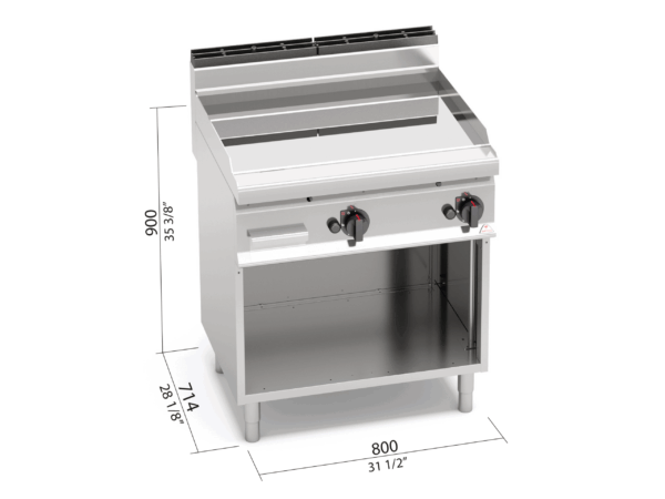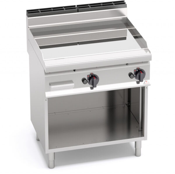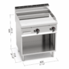 Piano di lavoro pannelli frontali e laterali in acciaio inox AISI 304. Bruciatori tubolari a fiamma auto stabilizzata di grande superficie per una maggiore uniformità di distribuzione del calore. Regolazione della potenza erogata tramite rubinetto termostatato. Fiamma pilota e valvola di sicurezza a termocoppia. Accensione piezoelettrica con protezione in silicone. Temperatura massima controllata entro i 280 °C. Piastra liscia ad alto spessore, a tutta misura con paraspruzzi a filo. Piastra di cottura bicomponente che combina una lastra di acciaio, per ottimizzare l’uniformità, ad un rivestimento superiore in acciaio inox AISI 316 con finitura lucida, per un’ottima pulizia e un basso livello di irraggiamento, con conseguente maggior confort per l’operatore. Due zone con comandi separati per una regolazione indipendente ed ottimale della temperatura. Particolarmente indicato per cotture delicate. Superficie di cottura leggermente inclinata con foro di scarico di grandi dimensioni e convogliatore in apposito contenitore a tenuta stagna. Piedini regolabili.
