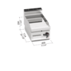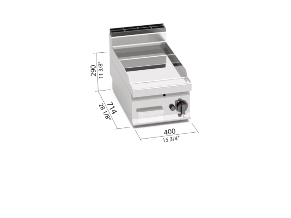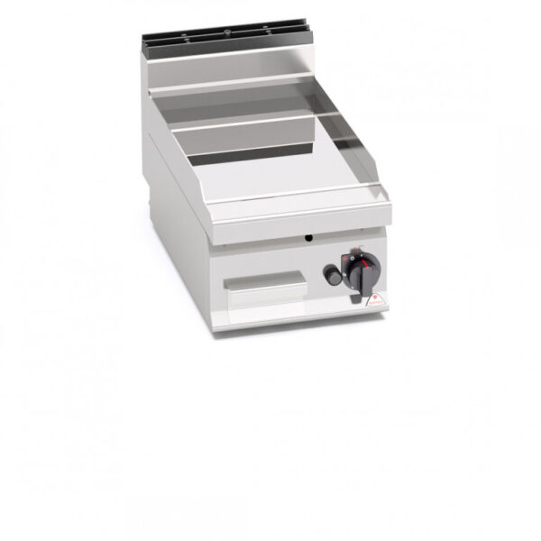 Piano di lavoro e pannelli frontali in acciaio inox AISI 304. Bruciatori tubolari a fiamma auto-stabilizzata di grande superficie per una maggiore uniformità di distribuzione del calore. Regolazione della potenza erogata tramite rubinetto termostatato. Fiamma pilota e valvola di sicurezza a termocoppia. Accensione piezoelettrica con protezione in silicone. Temperatura massima controllata entro i 280 °C. Piastra liscia ad alto spessore, a tutta misura con paraspruzzi a filo. Piastra di cottura bicomponente che combina una lastra di acciaio, per ottimizzare l’uniformità, ad un rivestimento superiore in acciaio inox AISI 316 con finitura lucida, per un’ottima pulizia e un basso livello di irraggiamento, con conseguente maggior confort per l’operatore. Superficie di cottura leggermente inclinata con foro di scarico di grandi dimensioni e convogliatore in apposito contenitore a tenuta di liquidi. Particolarmente indicato per cotture delicate. Piedini regolabili.