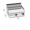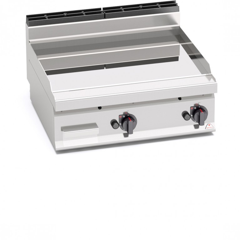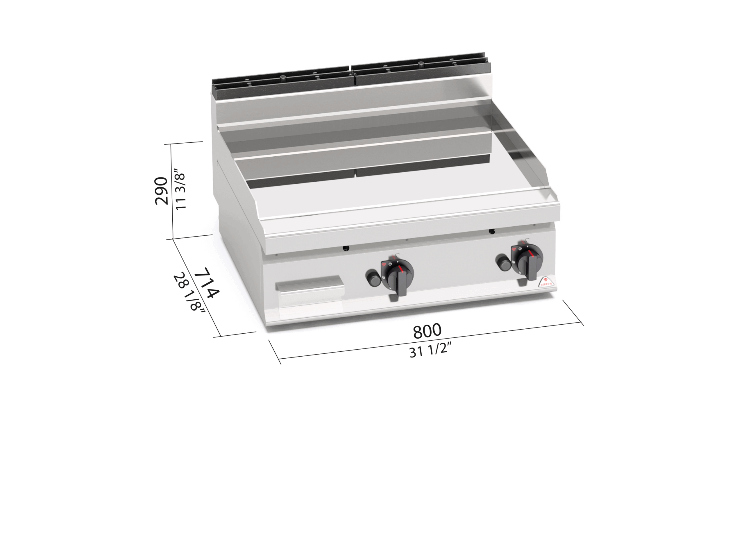 Piano di lavoro pannelli frontali e laterali in acciaio inox AISI 304. Bruciatori tubolari a fiamma auto stabilizzata di grande superficie per una maggiore uniformità di distribuzione del calore. Regolazione della potenza erogata tramite rubinetto termostatato. Fiamma pilota e valvola di sicurezza a termocoppia. Accensione piezoelettrica con protezione in silicone. Temperatura massima controllata entro i 280 °C. Piastra liscia ad alto spessore, a tutta misura con paraspruzzi a filo. Piastra di cottura bicomponente che combina una lastra di acciaio, per ottimizzare l’uniformità, ad un rivestimento superiore in acciaio inox AISI 316 con finitura lucida, per un’ottima pulizia e un basso livello di irraggiamento, con conseguente maggior confort per l’operatore. Due zone con comandi separati per una regolazione indipendente ed ottimale della temperatura. Particolarmente indicato per cotture delicate. Superficie di cottura leggermente inclinata con foro di scarico di grandi dimensioni e convogliatore in apposito contenitore a tenuta stagna. Piedini regolabili.