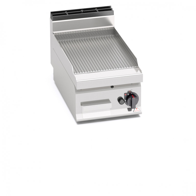 Piano di lavoro e pannelli frontali in acciaio inox AISI 304. Bruciatori tubolari a fiamma auto stabilizzata di grande superficie per una maggiore uniformità di distribuzione del calore. Regolazione della potenza erogata tramite rubinetto a funzionamento continuo. Fiamma pilota e valvola di sicurezza a termocoppia. Accensione piezoelettrica con protezione in silicone. Temperatura massima oltre i 300°C. Piastra RIGATA in acciaio satinato con paraspruzzi a filo. Superficie di cottura leggermente inclinata con foro di scarico di grandi dimensioni e convogliatore in apposito contenitore a tenuta di liquidi. Piedini regolabili (versione con mobile).