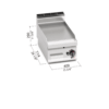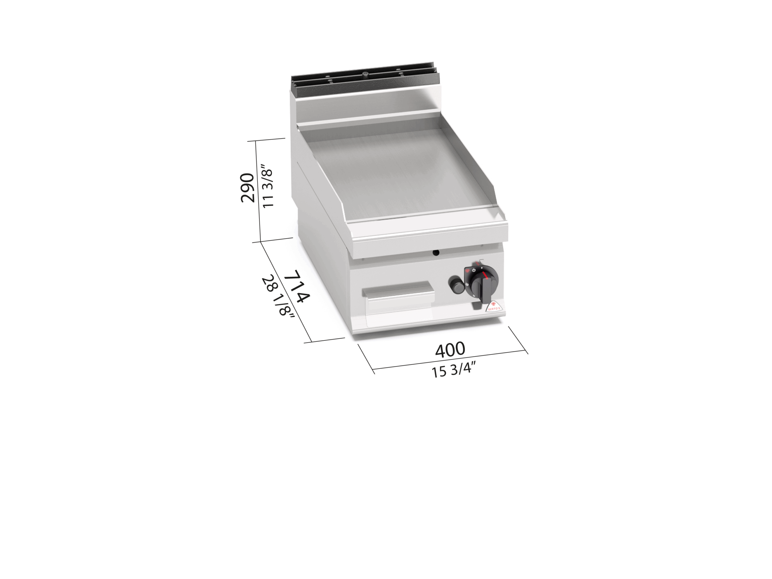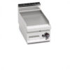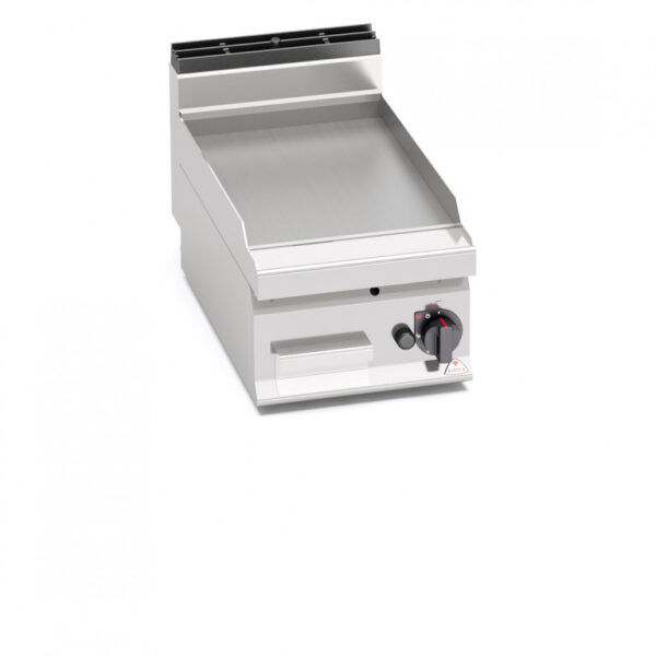 Piano di lavoro e pannelli frontali in acciaio INOX AISI 304. Bruciatori tubolari a fiamma auto-stabilizzata di grande superficie per una maggiore uniformità di distribuzione del calore. Regolazione della potenza erogata tramite rubinetto a funzionamento continuo. Fiamma pilota e valvola di sicurezza a termocoppia. Accensione piezoelettrica con protezione in silicone. Temperatura massima oltre i 300°C. Piastra LISCIA in acciaio satinato con paraspruzzi a filo. Superficie di cottura leggermente inclinata con foro di scarico di grandi dimensioni e convogliatore in apposito contenitore a tenuta di liquidi. Piedini regolabili (versione con mobile).