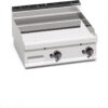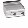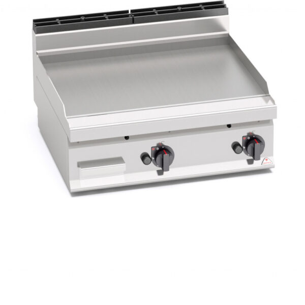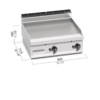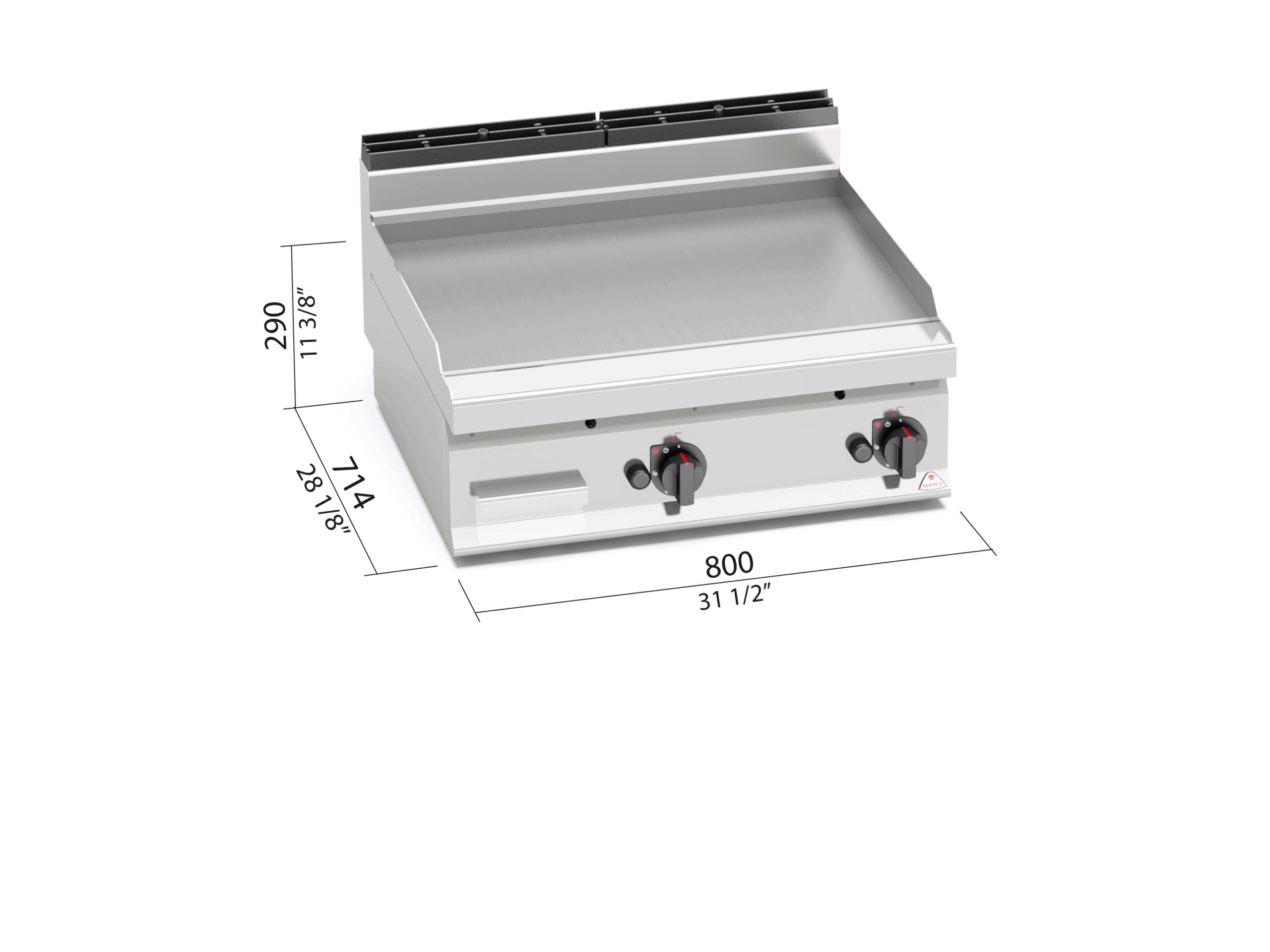 Piano di lavoro e pannelli frontali in acciaio inox AISI 304. Bruciatori tubolari a fiamma auto stabilizzata di grande superficie per una maggiore uniformità di distribuzione del calore. Regolazione della potenza erogata tramite rubinetto a funzionamento continuo. Fiamma pilota e valvola di sicurezza a termocoppia. Accensione piezoelettrica con protezione in silicone. Temperatura massima oltre i 300°C. Piastra liscia in acciaio satinato con paraspruzzi a filo. Due zone con comandi separati per una regolazione indipendente ed ottimale della temperatura. Superficie di cottura leggermente inclinata con foro di scarico di grandi dimensioni e convogliatore in apposito contenitore a tenuta di liquidi. Piedini regolabili (versione con mobile).