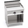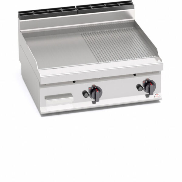 Piano di lavoro e pannelli frontali in acciaio inox AISI 304. Bruciatori tubolari a fiamma auto stabilizzata di grande superficie per una maggiore uniformità di distribuzione del calore. Regolazione della potenza erogata tramite rubinetto a funzionamento continuo. Fiamma pilota e valvola di sicurezza a termocoppia. Accensione piezoelettrica con protezione in silicone. Temperatura massima oltre i 300°C. Piastra metà liscia e metà rigata, in acciaio satinato con paraspruzzi a filo. Due zone con comandi separati per una regolazione indipendente ed ottimale della temperatura. Superficie di cottura leggermente inclinata con foro di scarico di grandi dimensioni e convogliatore in apposito contenitore a tenuta stagna. Piedini regolabili (versione con mobile).
