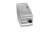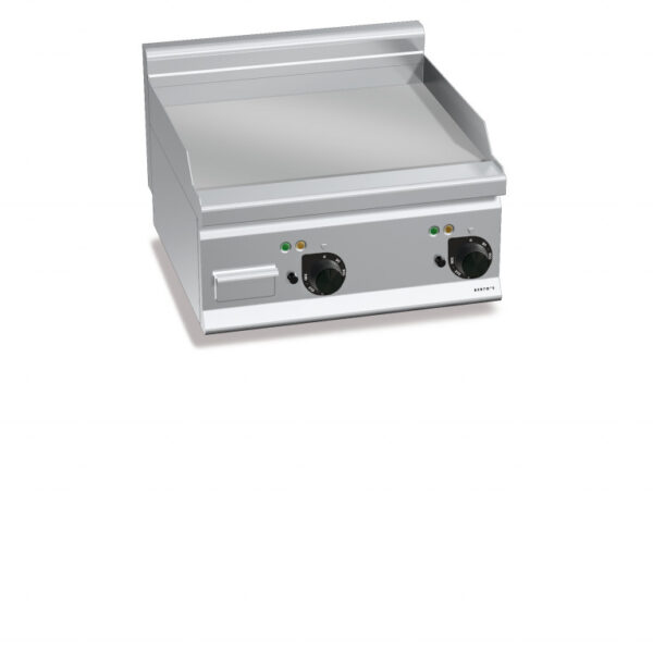 Fry top elettrico professionale con piastra liscia in acciaio satinato e due zone di cottura con comandi separati, progettato per garantire flessibilità operativa e gestione ottimale delle temperature durante il servizio.