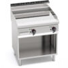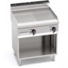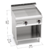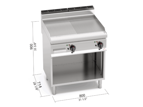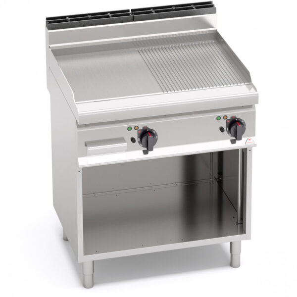 Piano di lavoro e pannelli frontali in acciaio inox AISI 304. Resistenze in acciaio incoloy poste sotto la piastra di cottura. Controllo termostatico e termostato di sicurezza a riarmo manuale. Regolazione della temperatura da 50°C. a 270°C. Spia di linea e spia di raggiungimento temperatura. Piastra metà liscia e metà rigata, in acciaio satinato con paraspruzzi a filo. Due zone con comandi separati per una regolazione indipendente ed ottimale della temperatura. Superficie di cottura leggermente inclinata con foro di scarico di grandi dimensioni e convogliatore in apposito contenitore a tenuta di liquidi. Piedini regolabili (versione con mobile).