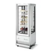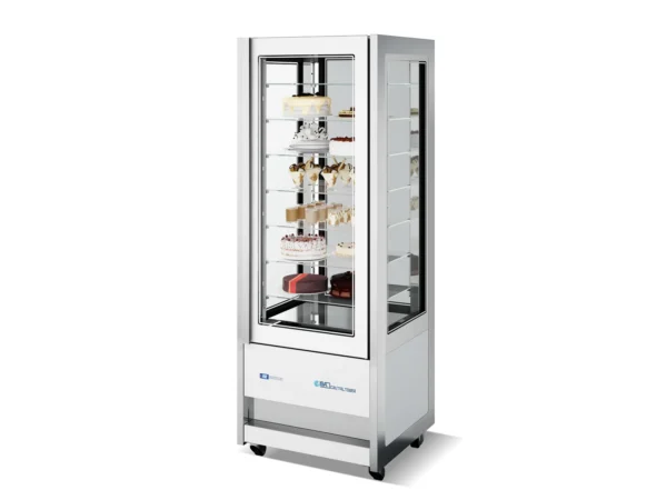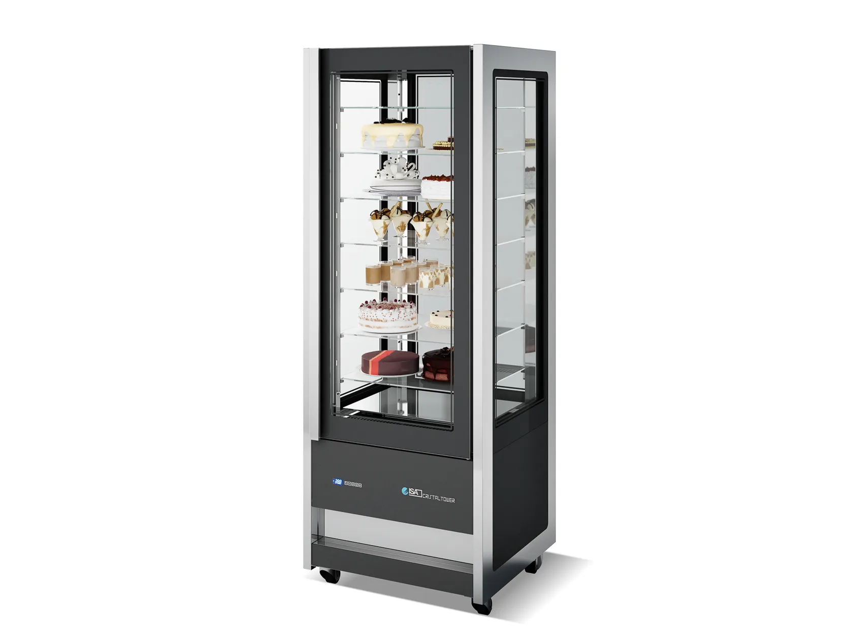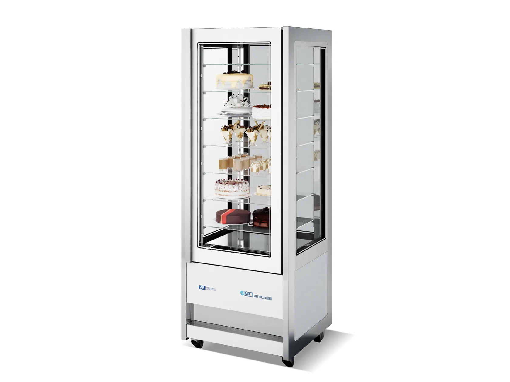 La vetrina ISA Cristal Tower è la creazione perfetta per chi, non volendo rinunciare all’altissima qualità di refrigerazione e conservazione del prodotto, ama il design e l’eleganza e vuole mostrare le sue creazioni nel massimo della bellezza. La vetrina Isa Cristal Tower con il suo vano espositivo completamente in vetro regala la massima visibilità dei prodotti su tutti e quattro i lati. Possiede un impianto frigo dimensionato per consentire un adeguato mantenimento della temperatura anche in caso di numerose aperture. La sua struttura monolitica coibentata in poliuretano ecologico espanso a C02 è a basso impatto ambientale. Vetri camera temprati completamente sostituibili. Porta a vetro camera temprato serigrafata a filo con i fianchi della vetrina. Maniglia di apertura sulla versione standard. Completa accessibilità al vano motore sia dal lato frontale che dal lato posteriore, grazie alla facile rimozione delle pannellature inferiori. Cerniera della porta dotata di barra torsionale di richiamo (self-closing). Ruote doppie pivotanti (due con freno di stazionamento) per una facile movimentazione.
