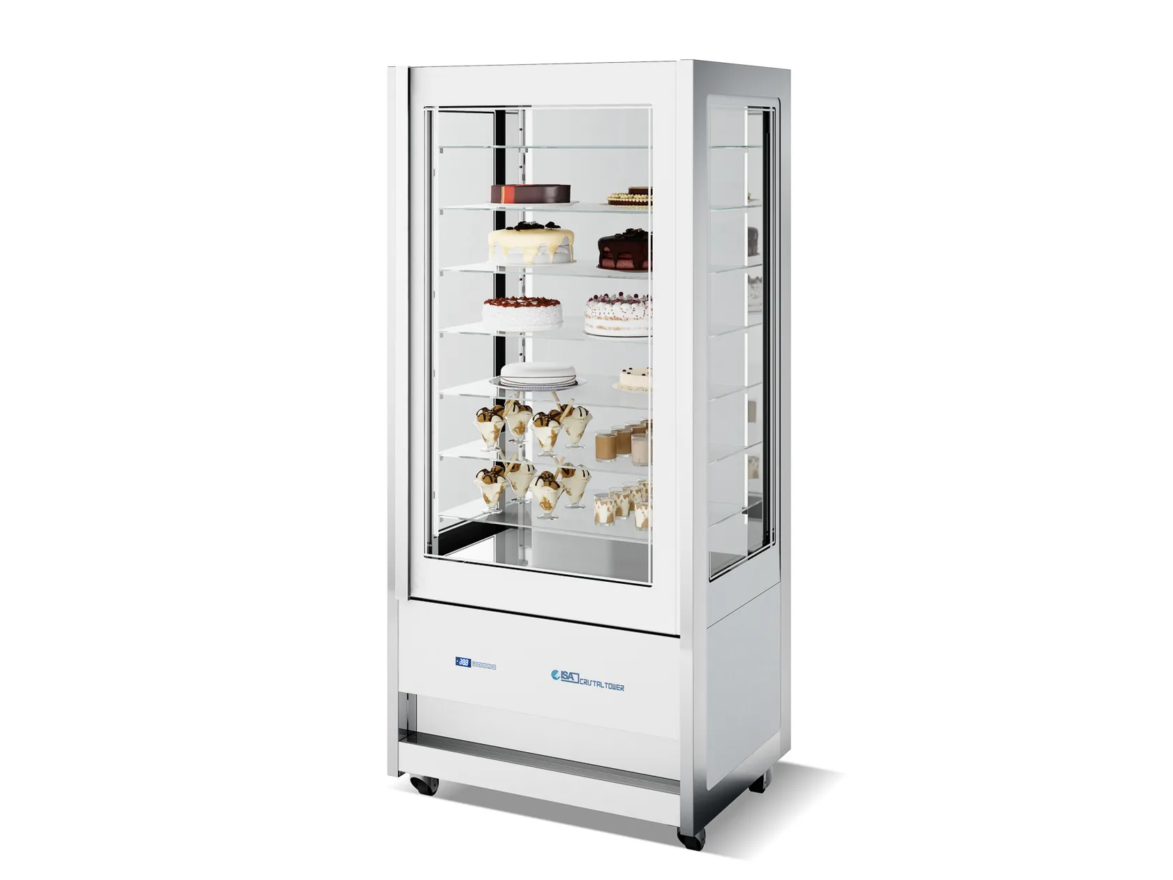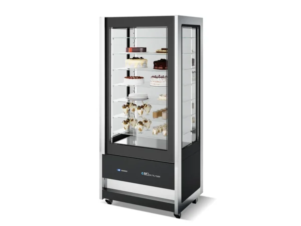 La vetrina ISA Cristal Tower è la creazione perfetta per chi, non volendo rinunciare all’altissima qualità di refrigerazione e conservazione del prodotto, ama il design e l’eleganza e vuole mostrare le sue creazioni nel massimo della bellezza. La vetrina Isa Cristal Tower con il suo vano espositivo completamente in vetro regala la massima visibilità dei prodotti su tutti e quattro i lati. Possiede un impianto frigo dimensionato per consentire un adeguato mantenimento della temperatura anche in caso di numerose aperture. La sua struttura monolitica coibentata in poliuretano ecologico espanso a C02 è a basso impatto ambientale. Vetri camera temprati completamente sostituibili. Porta a vetro camera temprato serigrafata a filo con i fianchi della vetrina. Maniglia di apertura sulla versione standard. Completa accessibilità al vano motore sia dal lato frontale che dal lato posteriore, grazie alla facile rimozione delle pannellature inferiori. Cerniera della porta dotata di barra torsionale di richiamo (self-closing). Ruote doppie pivotanti (due con freno di stazionamento) per una facile movimentazione.