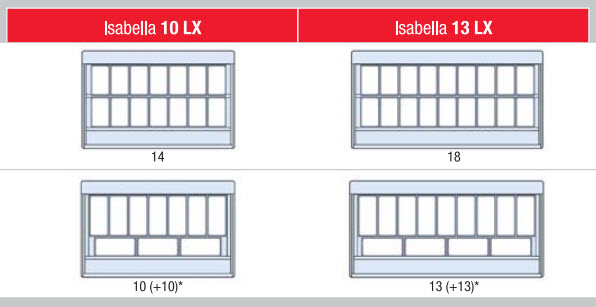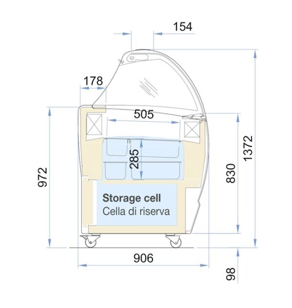 Vetrine gelato promozionali a refrigerazione statica con doppio evaporatore alettato e sbrinamento automatico a gas caldo. Scocca monolitica coibentata con poliuretano ecologico (HCFC & HFC free) espanso a C02. Interno ed esterno vasca in lamiera preverniciata; fianchi esterni estetici in stratificato. La vetrina può contenere un doppio livello di vaschette H120 ed è dotata di cella di riserva a refrigerazione statica con evaporatore a mantello. Sovrastruttura in cristallo temprato con vetro frontale curvo LX e plafoniera di illuminazione a Led. Chiusura lato operatore con tendina autoavvolgente. Piano di lavoro in lamiera plastificata. Unità condensatrice emetica a bordo con quadro comandi elettronico. Struttura in acciaio al carbonio verniciato a polvere, con 4 ruote pivottanti per facilitare la movimentazione.