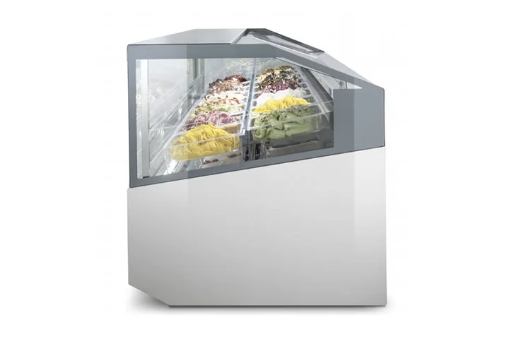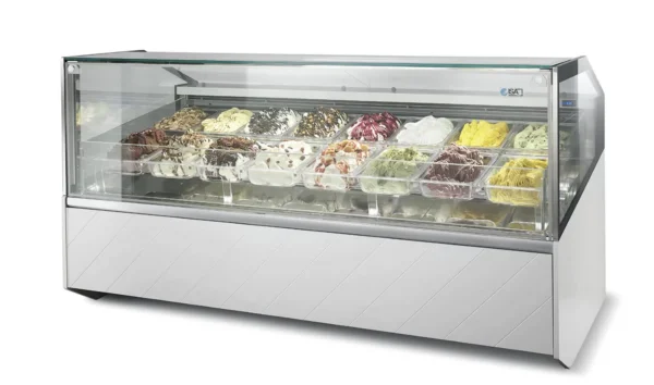 La vetrina da Gelateria ISA Supershow è l’unica vetrina gelato che consente di vedere il gelato in tre dimensioni, grazie alla vasca frontale e fianchi in vetro camera, alle vaschette trasparenti ed all’illuminazione frontale che risalta ulteriormente il gelato.