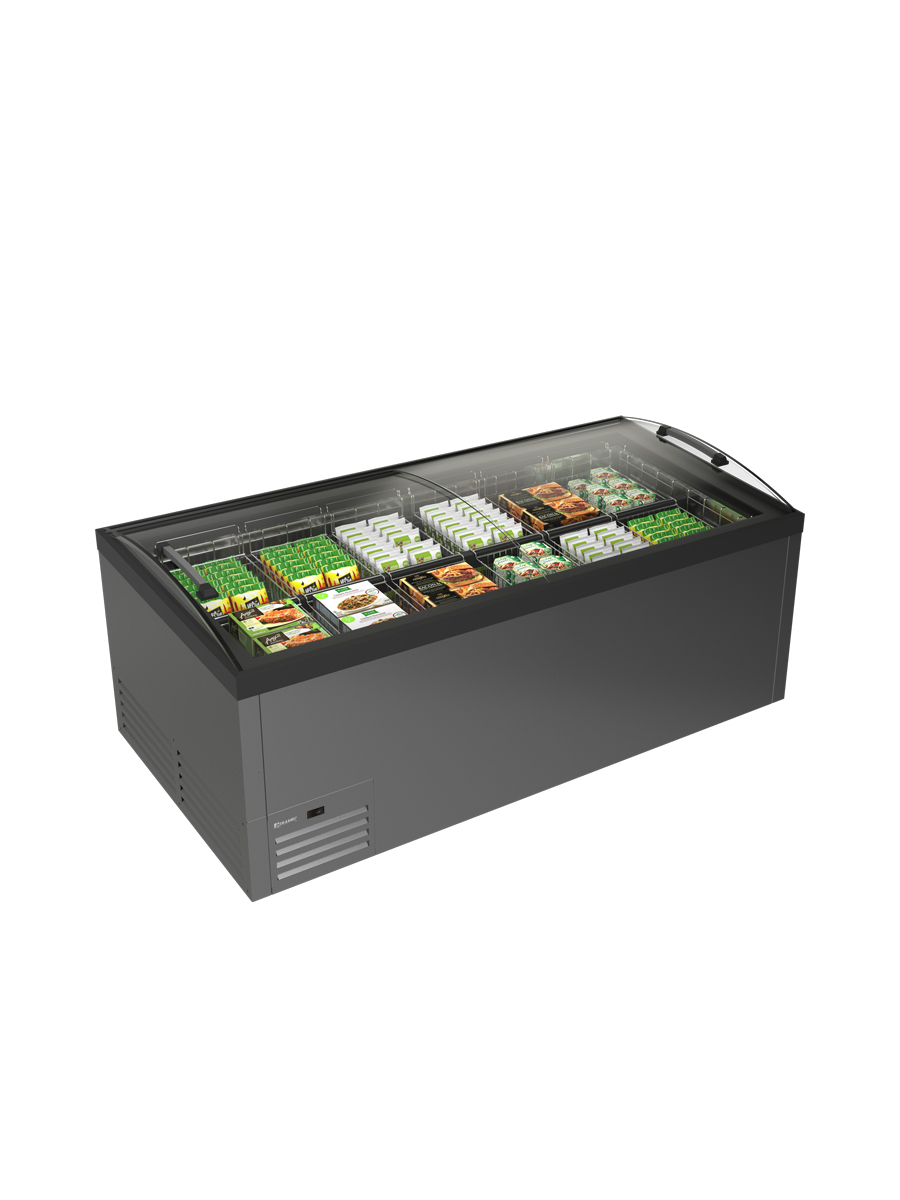 - Massima visibilità dei prodotti esposti grazie ai vetri curvi scorrevoli senza profili plastici