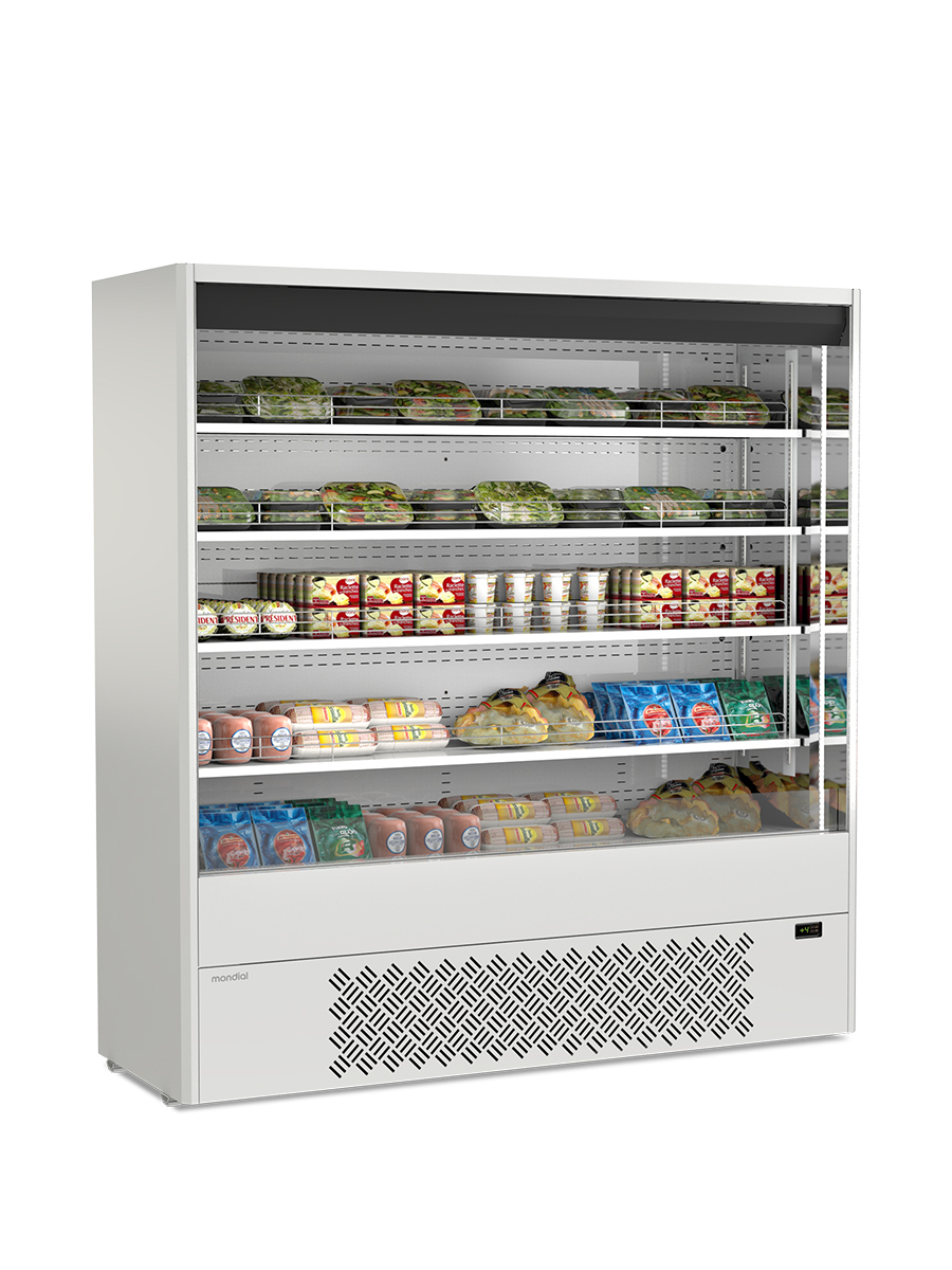 Il Murales 14 W Mondial è un espositore murale refrigerato ventilato pensato per garantire prestazioni elevate e massima visibilità dei prodotti freschi. La refrigerazione ventilata assicura una distribuzione uniforme del freddo, mantenendo una temperatura costante tra +0°C e +4°C, ideale per bevande, latticini e alimenti confezionati.