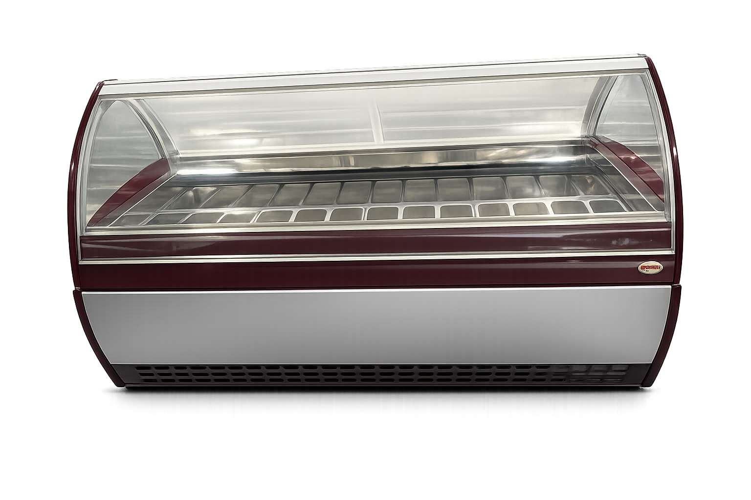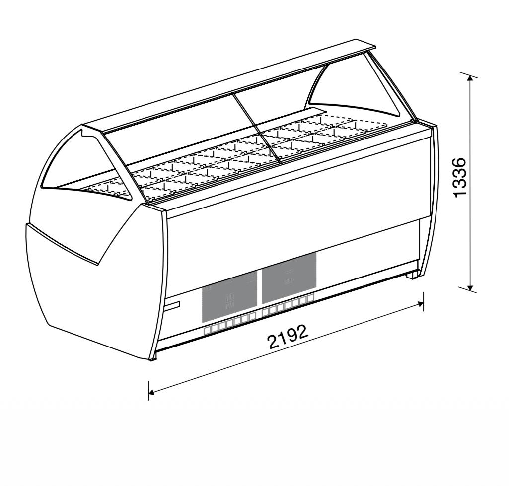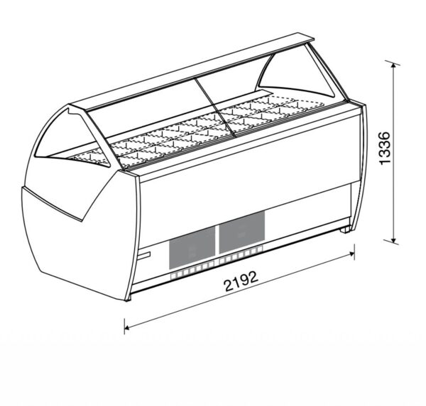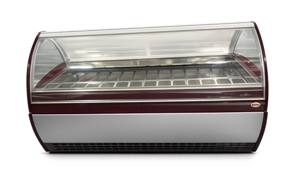 Il design con vetro curvo panoramico e illuminazione LED valorizza il gelato esposto, mentre la struttura coibentata assicura efficienza energetica e mantenimento ottimale della temperatura.