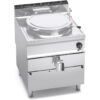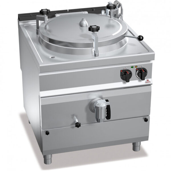 Piano di lavoro e pannelli frontali in acciaio inox AISI 304. Interno in acciaio inox. Recipiente di cottura in acciaio inox AISI 304 con spessore 15/10, fondo in acciaio inox AISI 316 con spessore 20/10. Intercapedine con fondo e pareti in acciaio inox AISI 304, fondo spessore 20/10, pareti spessore 15/10. Riscaldamento di tipo indiretto con vapore a bassa pressione (0,5 bar), generato all’interno dell’intercapedine tramite resistenze corazzate in incoloy dotate di termostato di sicurezza. Rubinetti di rabbocco acqua calda e fredda posti sul piano di lavoro con becco erogatore snodabile per il riempimento e il lavaggio del recipiente e dell’intercapedine. Rubinetto di scarico da 2 pollici in ottone cromato con maniglia atermica. Quattro blocchetti di fissaggio a vite, regolabili manualmente, con valvola a taratura fissa di 0,05 bar. Manometro meccanico con indicatore di pressione dell’intercapedine. Erogazione di potenza regolata da un commutatore a 3 posizioni. Comando separato per la regolazione della temperatura. Spia di linea e spia di raggiungimento temperatura.