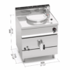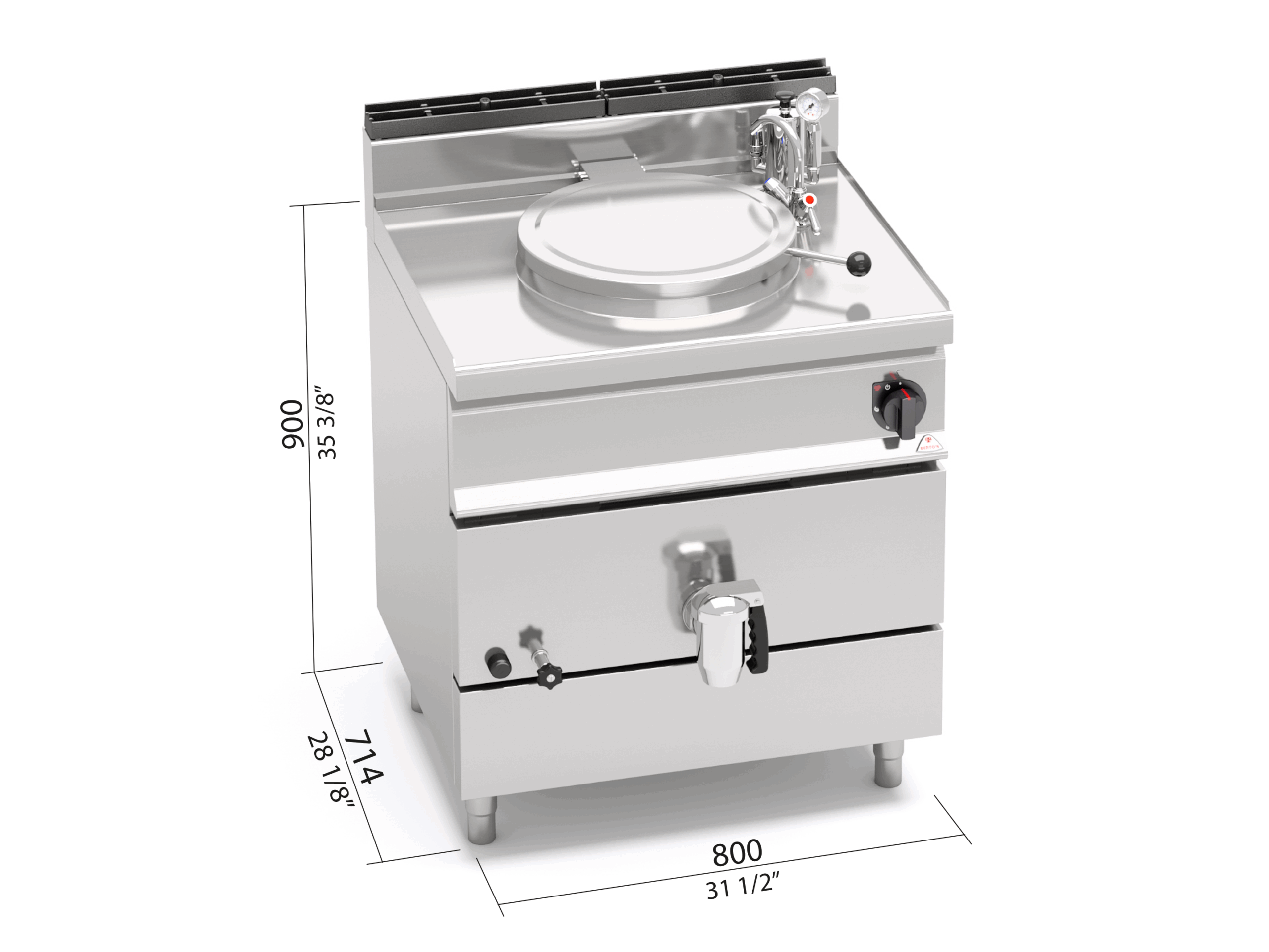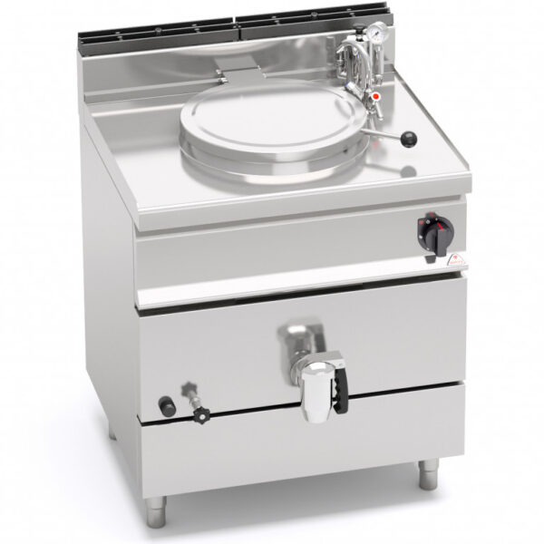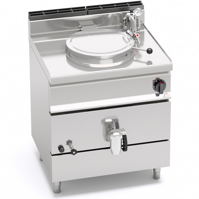 Piano di lavoro e pannelli frontali in acciaio inox AISI 304. Recipiente di cottura in acciaio inox AISI 304 con spessore 15/10, fondo in acciaio inox AISI 316 con spessore 20/10. Riscaldamento di tipo indiretto con vapore a bassa pressione (0,5 bar), generato all’interno dell’intercapedine da bruciatori tubolari in acciaio inox a combustione ottimizzata, con valvola di sicurezza a termocoppia e fiamma pilota protetta. Accensione piezoelettrica con protezione in silicone. Rubinetti di rabbocco acqua calda e fredda posti sul piano di lavoro con becco erogatore snodabile per il riempimento e il lavaggio del recipiente e dell’intercapedine. Rubinetto di scarico da un pollice e mezzo in ottone cromato con maniglia atermica. Manometro meccanico con indicatore di pressione dell’intercapedine. Regolazione della temperatura tramite rubinetto con minimo e massimo. Piedini regolabili.