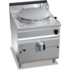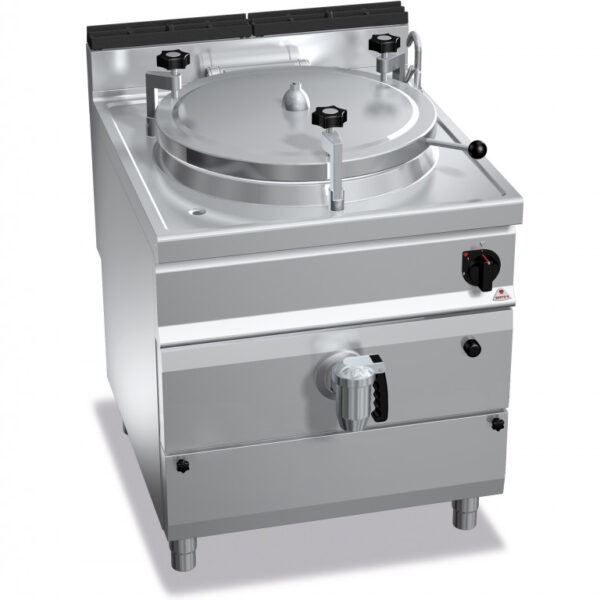Piano di lavoro e pannelli frontali in acciaio inox AISI 304. Interno in acciaio inox. Recipiente di cottura in acciaio inox AISI 304 con spessore 15/10, fondo in acciaio inox AISI 316 con spessore 20/10. Riscaldamento di tipo diretto, generato da bruciatori tubolari in acciaio inox a combustione ottimizzata, con valvola di sicurezza a termocoppia e fiamma pilota protetta. Accensione piezoelettrica con protezione in gomma. Rubinetti di rabbocco acqua calda e fredda posti sul piano di lavoro con becco erogatore snodabile per il riempimento e il lavaggio del recipiente. Rubinetto di scarico da 2 pollici in ottone cromato con maniglia atermica. Quattro blocchetti di fissaggio a vite, regolabili manualmente, con valvola a taratura fissa di 0,05 bar. Regolazione della temperatura tramite rubinetto con minimo e massimo.