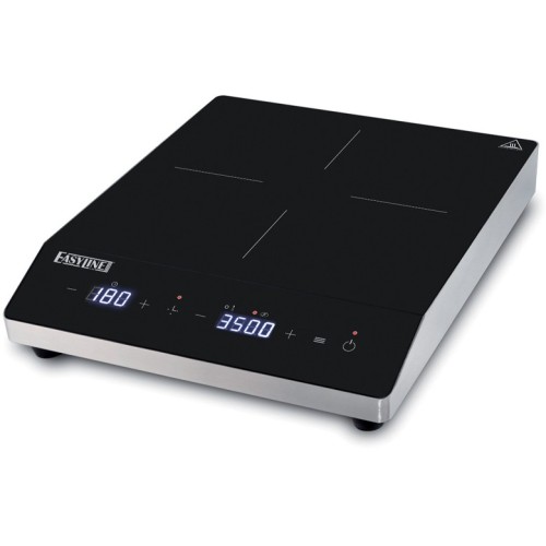 Piastra ad induzione con struttura in acciaio inox e piastra in vetroceramica.