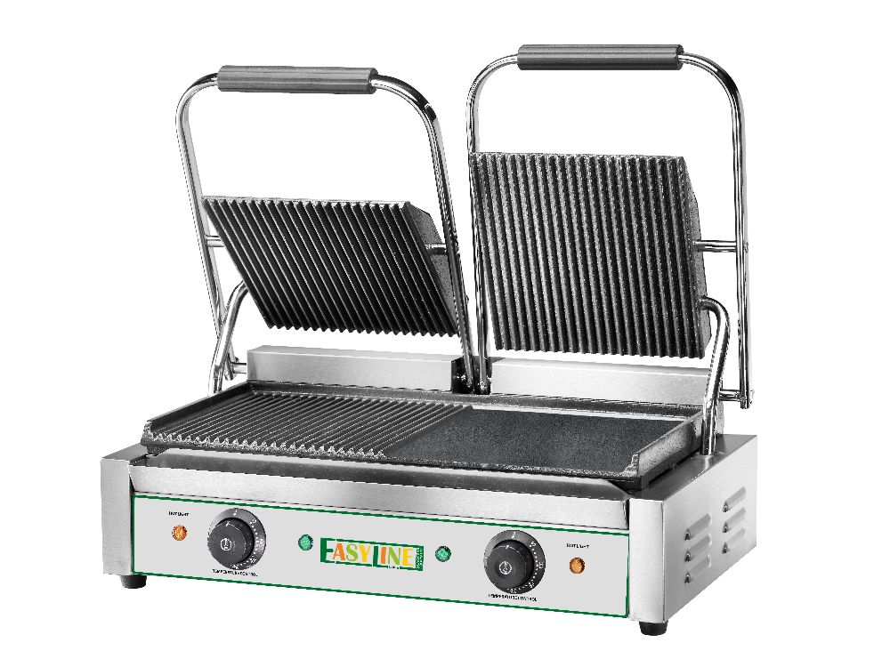 Macchina per cuocere e riscaldare carne, pesce, verdure, toast farciti, panini, ecc. Struttura in acciaio inox – piastra di cottura in ghisa – piastra superiore auto-bilanciata – piastre doppie miste (rigata e liscia).