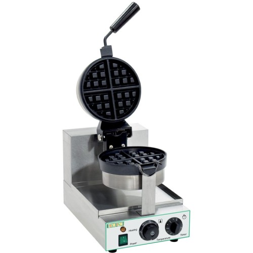 Macchina per waffle con struttura in acciaio inox e piastra di cottura teflonata.