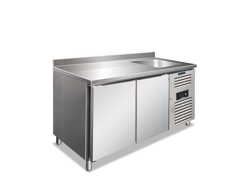 TAVOLO FRIGO REFRIGERATO POSITIVO 2 PORTE CON ALZATINA E LAVELLO – CLV 2200 TN – Temp. -2°C/+8°C Dim. Cm 151x70x96h