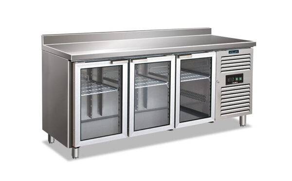TAVOLO FRIGO REFRIGERATO POSITIVO 3 PORTE IN VETRO CON ALZATINA – CXF 3200 TNG – Temp.  -2°C/+8°C Dim. Cm 179,5x70x96h