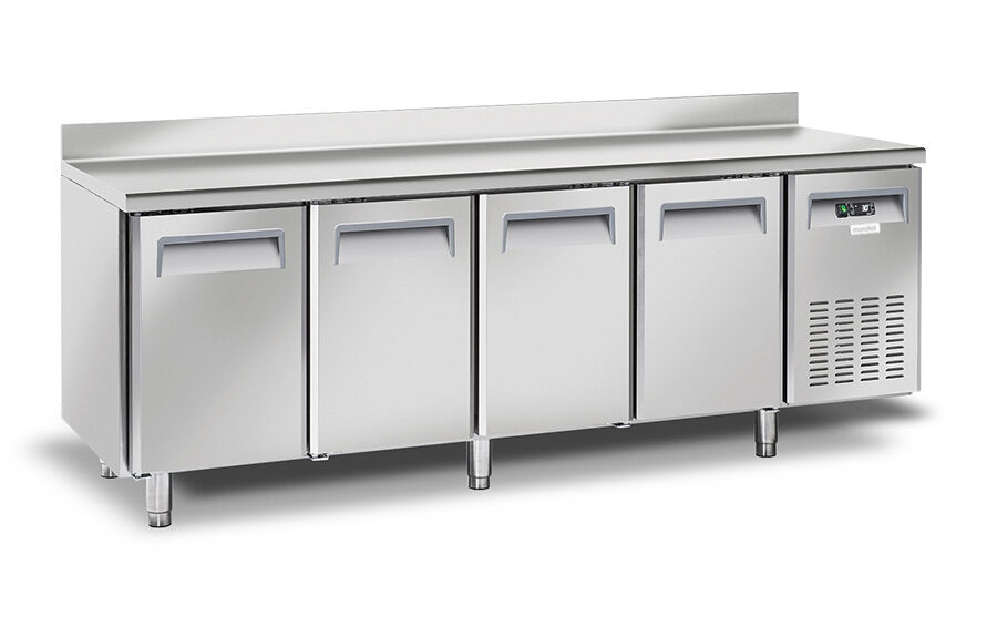 TAVOLO FRIGO REFRIGERATO POSITIVO 4 PORTE CON ALZATINA GN1/1 – TN – Temp. -2°C/+8°C Dim. Cm 225x70x95h