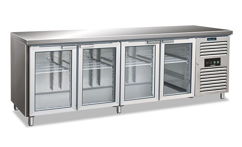 TAVOLO FRIGO REFRIGERATO POSITIVO 4 PORTE IN VETRO – CXF 4100 TNG – Temp. -2°C/+8°C Dim. Cm 223x70x86h