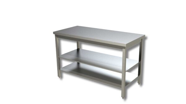 TAVOLO IN ACCIAIO INOX SU GAMBE CON DUE RIPIANI – Prof. cm 60