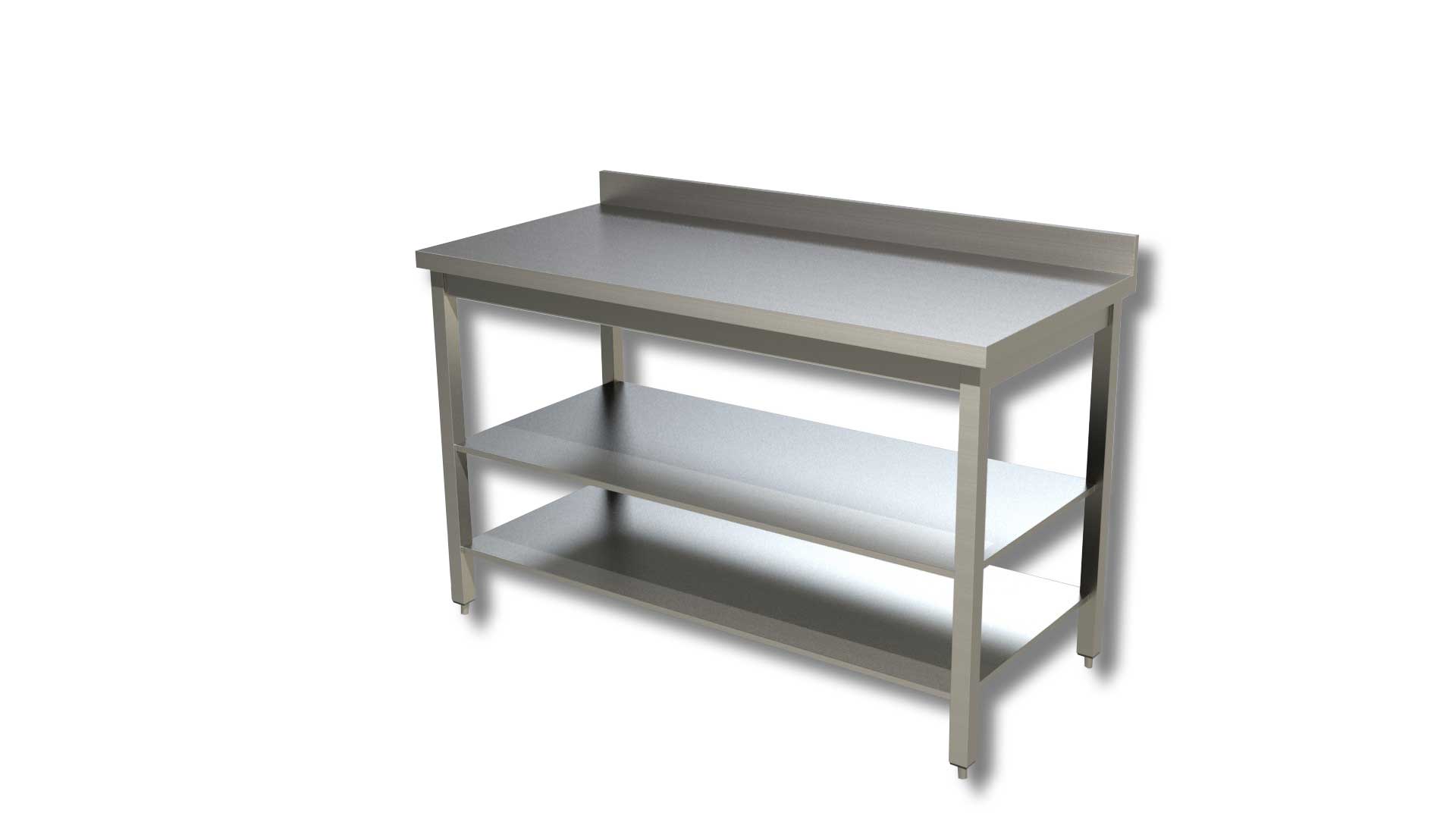 TAVOLO IN ACCIAIO SU GAMBE CON DUE RIPIANI ED ALZATINA – Prof. cm 60