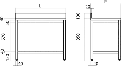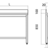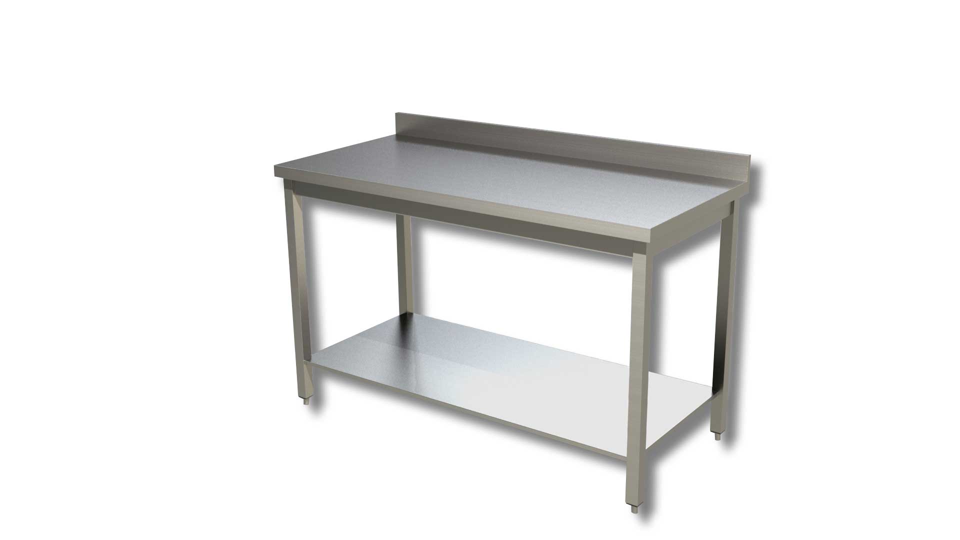 TAVOLO IN ACCIAIO SU GAMBE CON RIPIANO ED ALZATINA – Prof. cm 60
