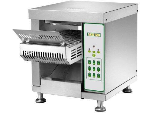 Struttura in acciaio inox con tappeto di tostatura girevole in acciaio inox e camera di cottura rivestita in materiale isolante. Regolazione elettronico velocità scorrimento tappeto di cottura
