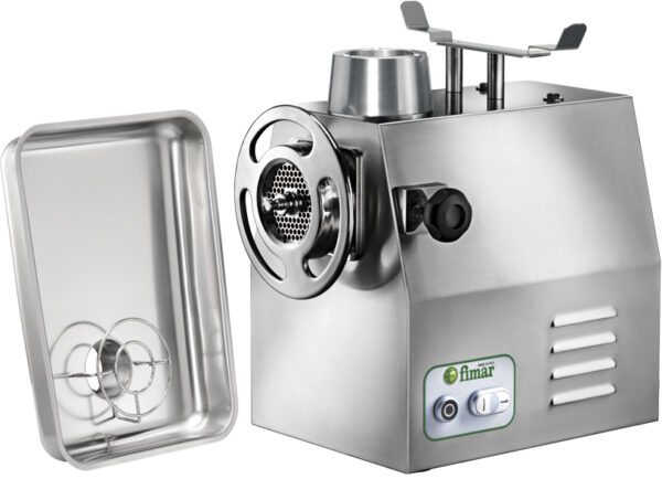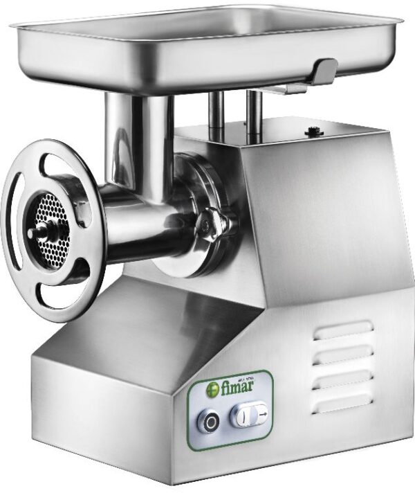 Carcassa e tramoggia in acciaio inox. Macchina con gruppo di macinazione completamente removibile che permette di poterlo collocare in frigorifero senza che debba essere pulito dai residui di carne macinata dopo ogni utilizzo in conformità con le norme di igiene HACCP – il gruppo di macinazione in acciaio inox AISI 304 può essere lavato in lavastoviglie – ventola di raffreddamento – bocca ingresso carne ø 76 mm – microinterruttori di sicurezza su tramoggia – inversione di marcia – riduttore con ingranaggi a bagno d’olio – comandi in bassa tensione – in dotazione sistema enterprise con piastra inox (fori ø 6 mm) e coltello inox autoaffilante. Peso netto: 43 Kg – Peso lordo 49 Kg.