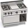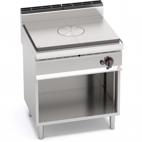 Piano di lavoro e pannelli frontali in acciaio inox AISI 304. Piastra in ghisa di grandi dimensioni ad alto spessore con caratteristiche di elevata resistenza e distribuzione del calore a zone termiche differenziate: temperatura massima al centro e decrescente verso i bordi. Bruciatori centrali da 5 kW a combustione ottimizzata, azionati da rubinetto valvolato con termocoppia di sicurezza e spia pilota. Accensione piezoelettrica con protezione in silicone e rivestimento della camera di combustione in vermiculite, materiale ad alte prestazioni isolanti. Piedini regolabili.