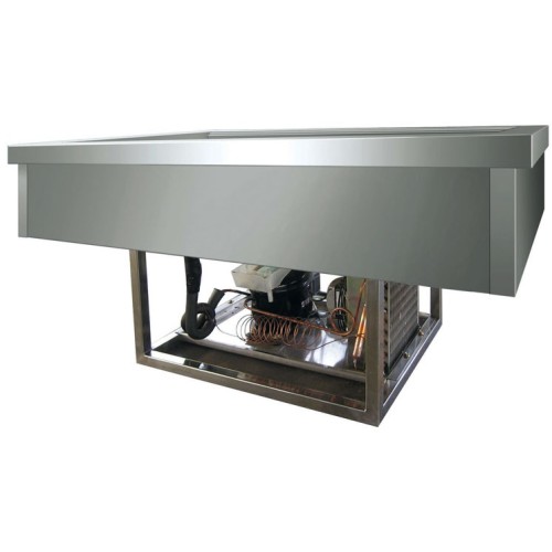 Vasche refrigerate da incasso in acciaio inox AISI 304. Struttura in acciaio inox AISI 304 – spessore isolamenti 50 mm – refrigerazione statica – gruppo incorporato nel vano inferiore – controllo temperatura elettronico con termostato digitale – sbrinamento automatico – evaporazione dell’acqua di condensa automatica.