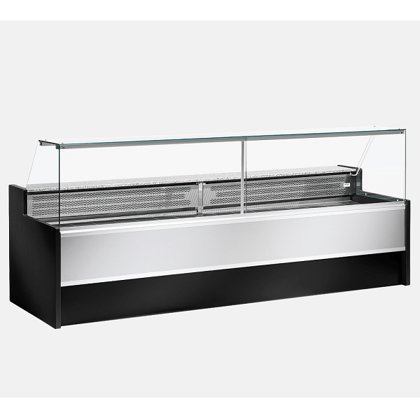 Banco frigo alimentare linea Mesetas di profondità 98 cm. Il design ricercato e l’ampia superficie espositiva rendono questa vetrina ideale per l’esposizione e la conservazione di carne (refrigerazione ventilata) e salumi, latticini e altri prodotti di gastronomia (refrigerazione statica).