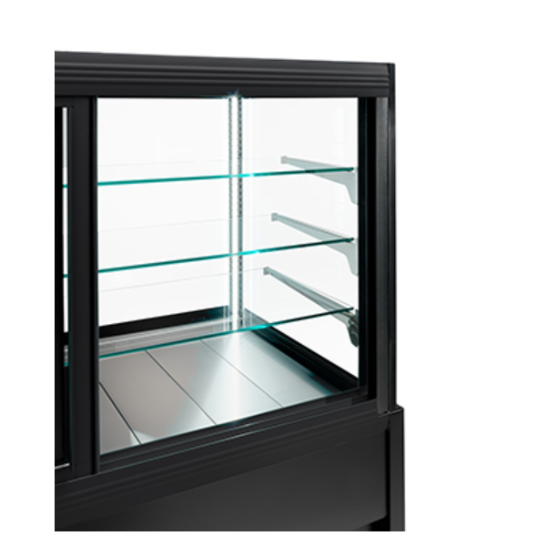 Tutta la struttura in vetro è in vetrocamera, dotato di 3 ripiani refrigerati in vetro, piano inferiore in acciaio AISI 304, illuminazione laterale a LED (la versione calda è senza illuminazione), spalle in lamiera con isolamento, con sbrinamento automatico, smaltimento dell’acqua di sbrinamento con doppia vaschetta.