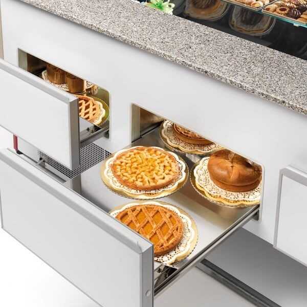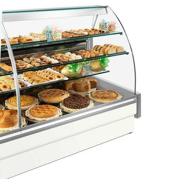 Banco frigo alimentare linea Colorado di profondità 98 cm. Il design elegante e l’ampia superficie espositiva rendono questa vetrina ideale per l’esposizione e la conservazione all’interno di pasticcerie. Prodotto fabbricato in Italia.