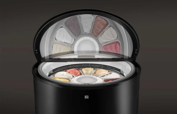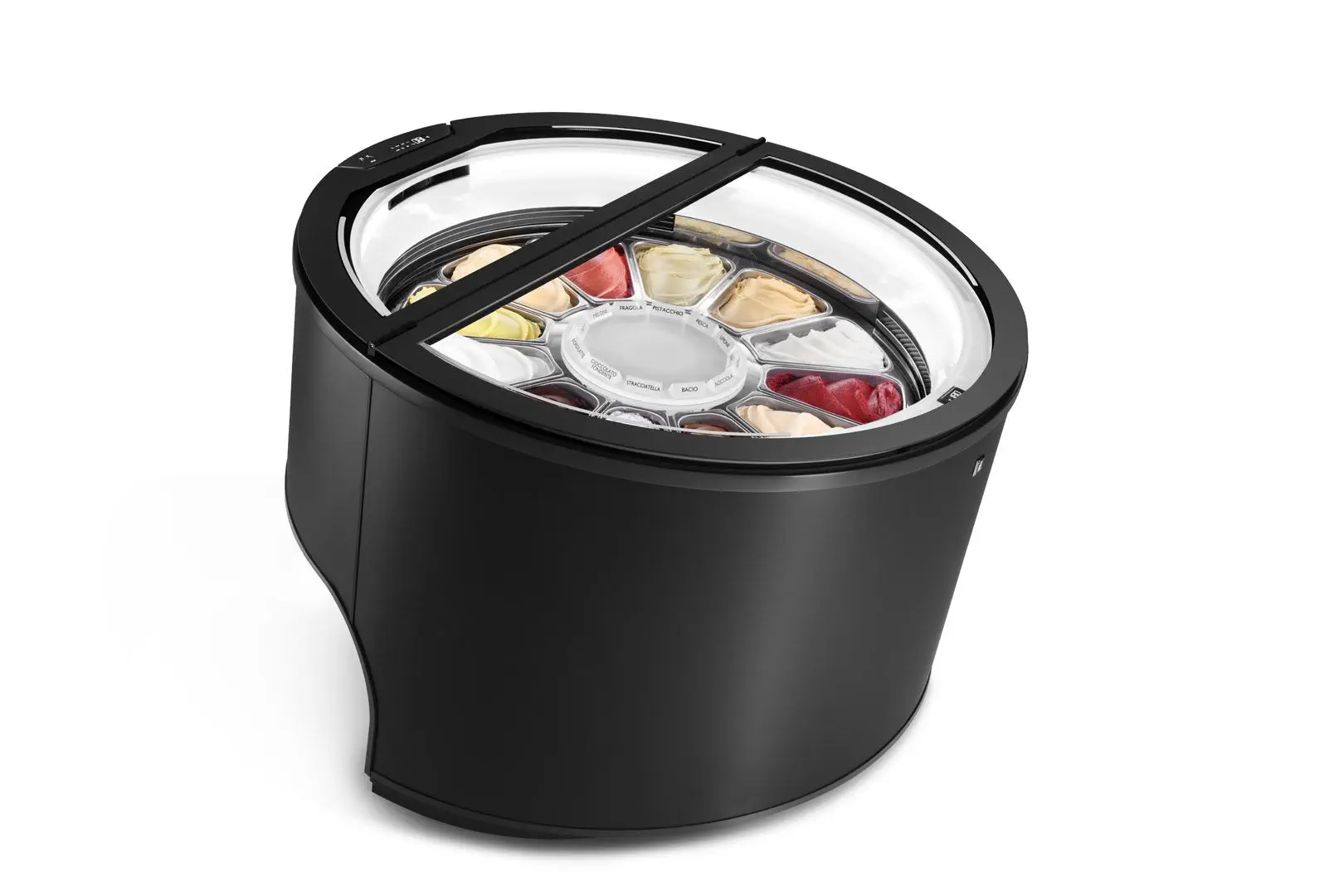 • Grazie ai sensori posizionati sulla cornice, a destra e a sinistra, la rotazione si attiva con un semplice gesto della mano, in una direzione o nell’altra. Non appena raggiunta la vaschetta desiderata, inserendo la mano per prelevare il gelato la rotazione si blocca grazie al sensore posto all’interno alla vasca.
