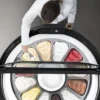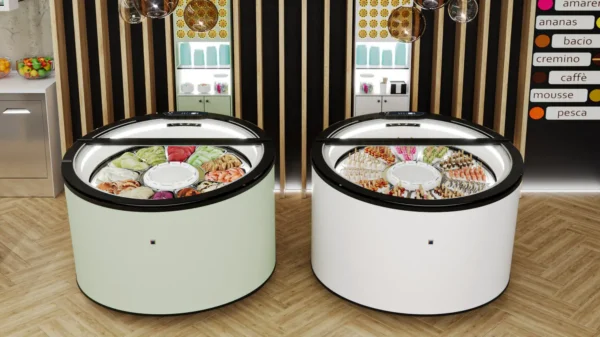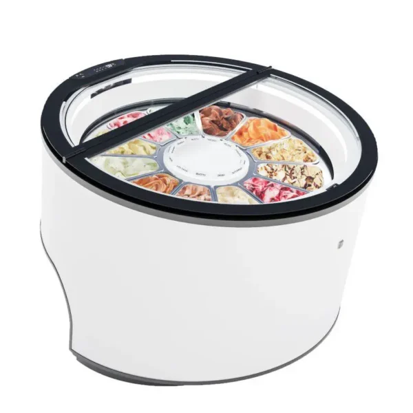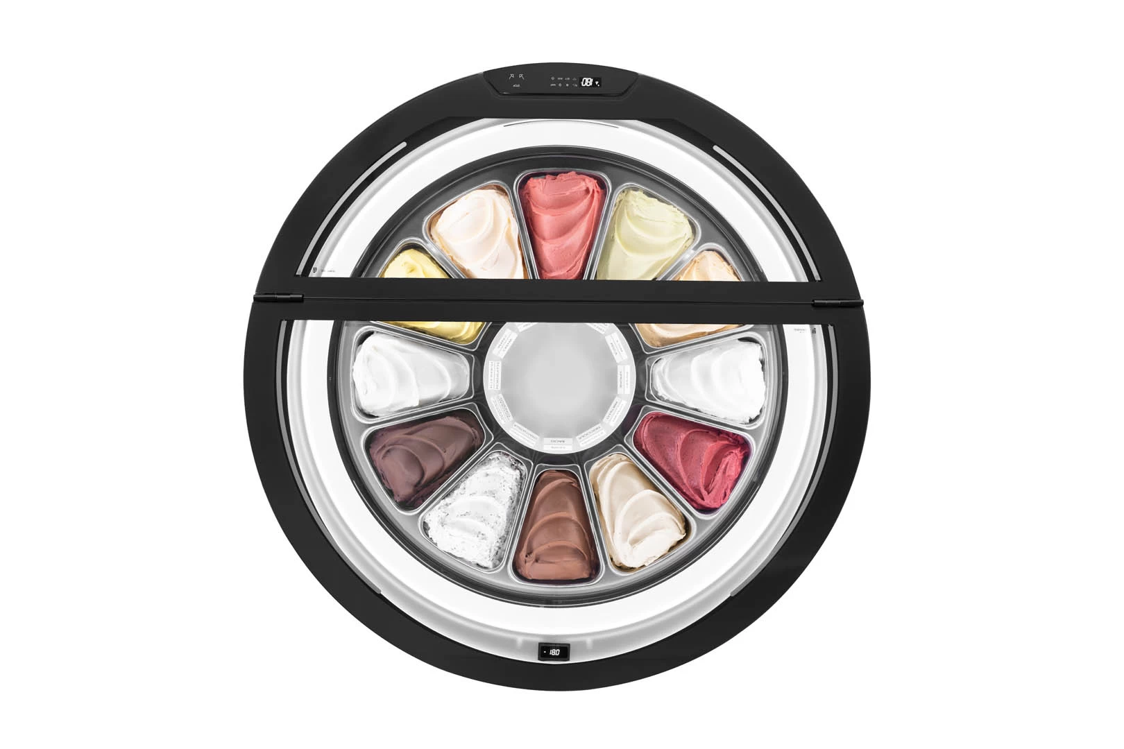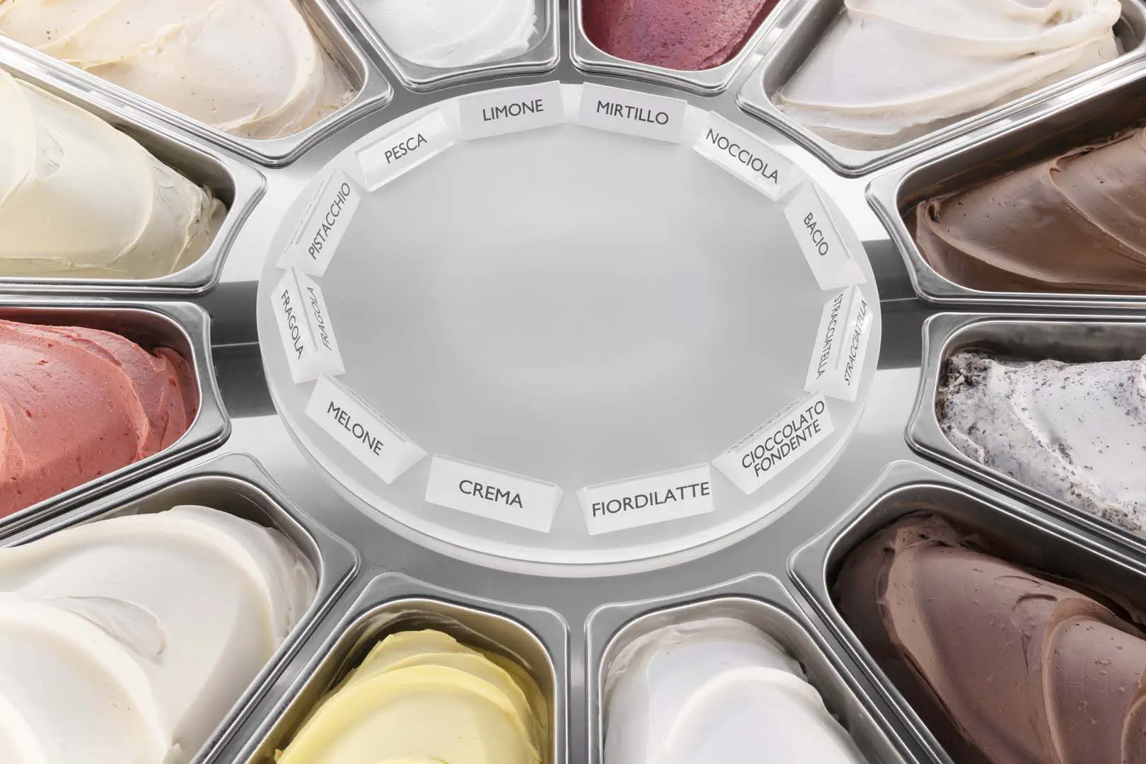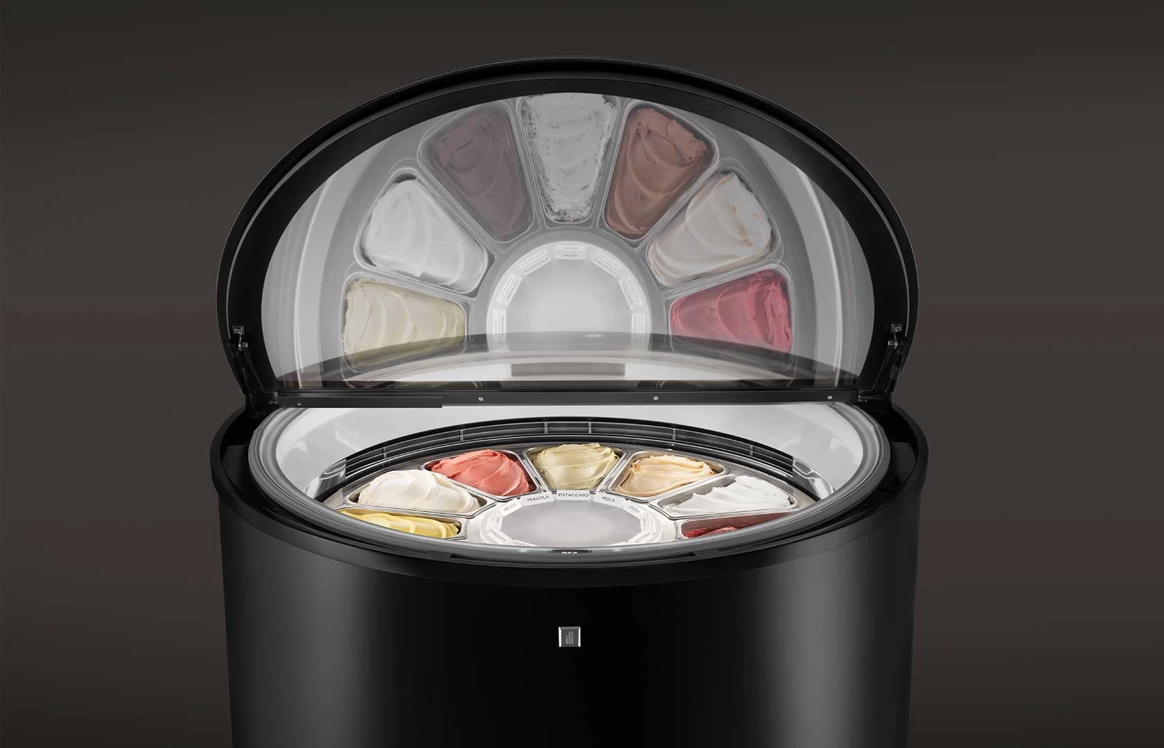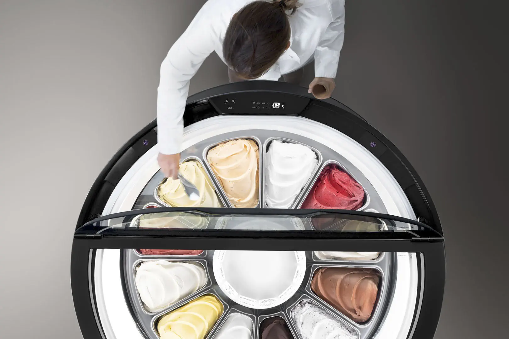 • Il piano espositivo ruota grazie a un motoriduttore comandato da un impianto elettronico. Il movimento rotatorio, oltre a garantire l’uniformità di temperatura sul gelato, permette all’operatore di raggiungere il prodotto in vetrina mantenendo una postura perfettamente ergonomica.