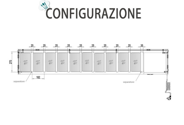 VETRINA INGREDIENTI REFRIGERATA 10 VASCHETTE GN1/4 Statica – Temp. +2°C/+8°C Dim. Cm 200,5×33,5×46,5h