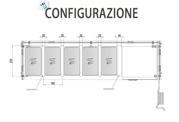 VETRINA INGREDIENTI REFRIGERATA 5 VASCHETTE GN1/4 – Statica – Temp. +2°C/+8°C Dim. Cm 120,5×33,5×46,5h