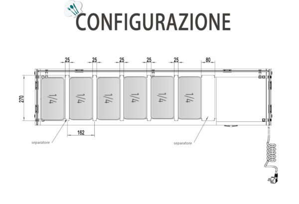 VETRINA INGREDIENTI REFRIGERATA 6 VASCHETTE GN1/4 – Statica – Temp. +2°C/+8°C Dim. Cm 141,5×33,5×46,5h