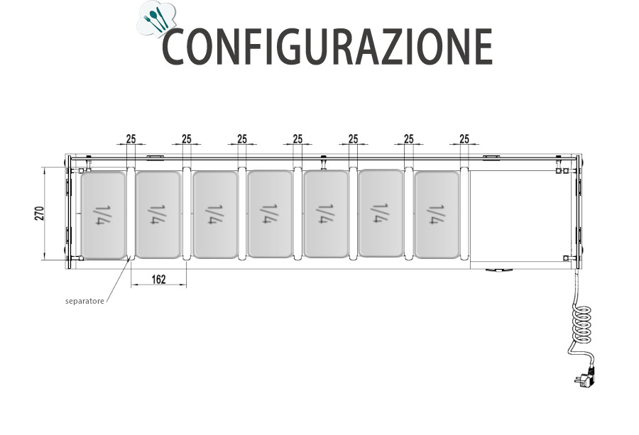 VETRINA INGREDIENTI REFRIGERATA 7 VASCHETTE GN1/4 – Statica – Temp. +2°C / +8°C Dim. Cm 150,5×33,5×46,5h