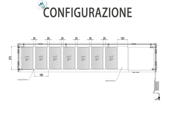 VETRINA INGREDIENTI REFRIGERATA 7 VASCHETTE GN1/4 – Statica – Temp. +2°C / +8°C Dim. Cm 160,5×33,5×46,5h