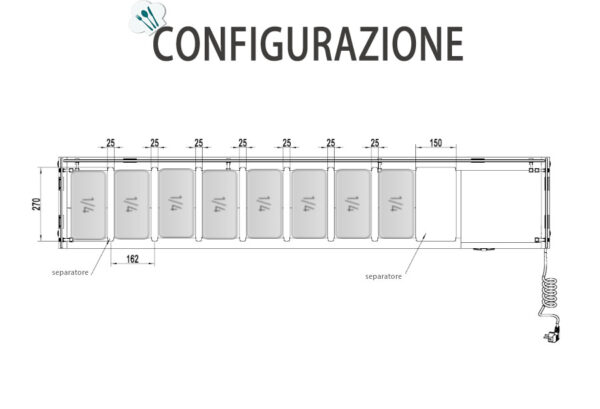 VETRINA INGREDIENTI REFRIGERATA 8 VASCHETTE GN1/4 – Statica – Temp. +2°C/+8°C Dim. Cm 180,5×33,5×46,5h