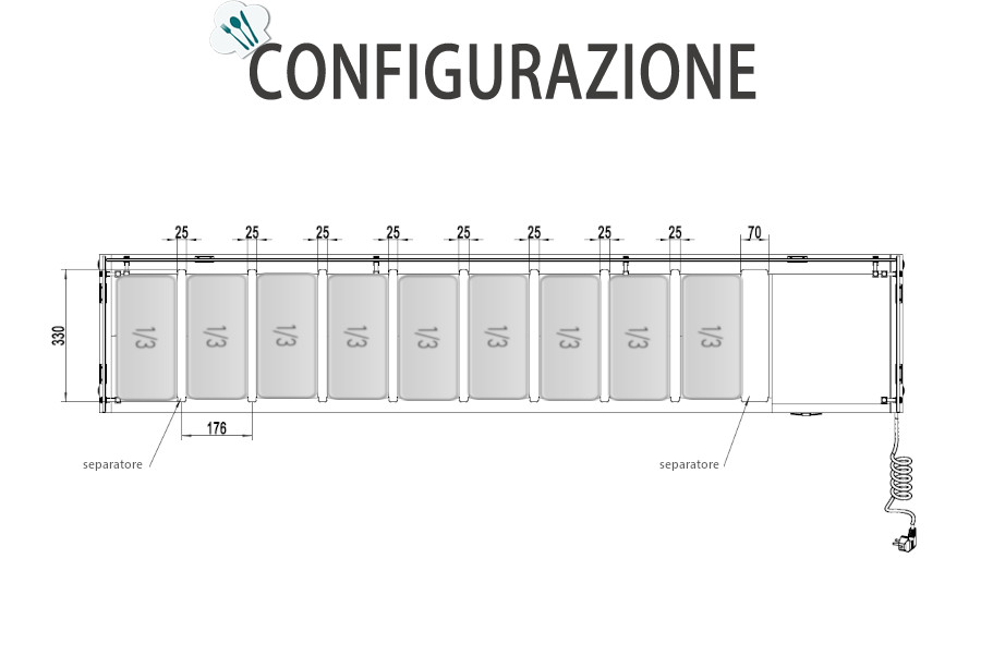 VETRINA INGREDIENTI REFRIGERATA 9 VASCHETTE GN1/3 Statica – Temp. +2°C/+8°C Dim. Cm 200,5×39,5×46,5h