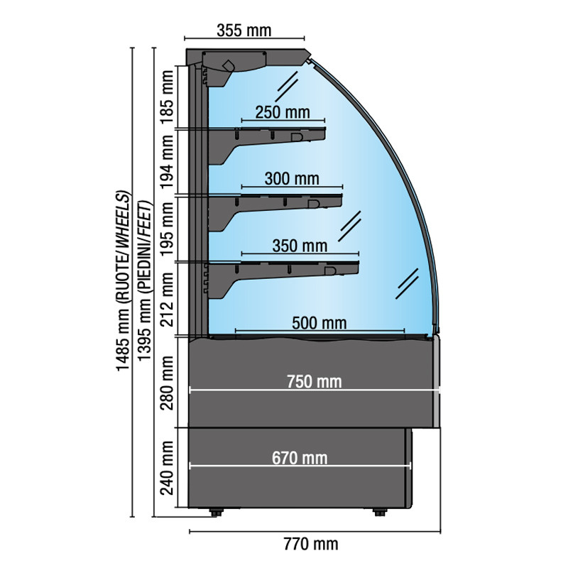 Dal design semplice ed elegante, questo modello rappresenta un’ottima soluzione per soddisfare le diverse esigenze della clientela, grazie alla sua flessibilità nell’utilizzo ed alla modularità (disponibile nelle lunghezze: 60-90-120-150-180-240 cm). I vetri curvi panoramici e le 3 mensole refrigerate, tutte dotate di illuminazione di serie in aggiunta a quella superiore, offrono una grande visibilità dei prodotti esposti.