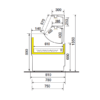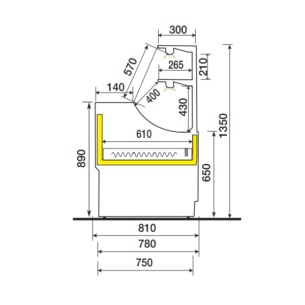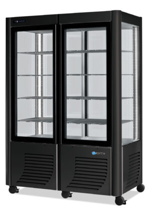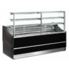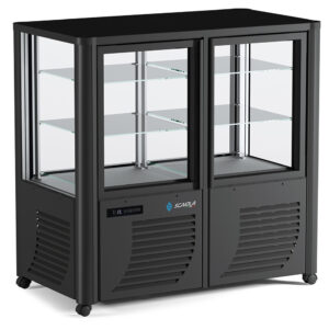 Piano lavoro in acciaio inox. Spalle laterali in ABS termoformate, piano espositivo in acciaio inox 304, illuminazione superiore, quadro comandi con termostato elettronico e sbrinamento a pausa, bacinella raccogli condensa a scarico manuale. Vetro intermedio con illuminazione di serie, non refrigerato. Tutti i vetri sono temperati.