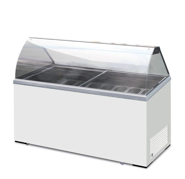 Questa vetrina è ideale per conservare e esporre il gelato artigianale, offrendo ai clienti una vasta scelta di gusti e una visibilità ottimale. La vetrina ha una capacità di 467 litri e predisposta per 8 vaschette da 5 litri ciascuna, escluse e d acquistare come optional. Questa vetrina espositore ha una struttura esterna in lamiera preverniciata bianca con trattamento anticorrosione e una superficie interna in alluminio martellato, che la rende resistente e facile da pulire. La vetrina è dotata di un vetro curvo e fisso, che protegge il gelato dalle variazioni di temperatura e dall’umidità e una refrigerazione statica, che garantisce una temperatura di esercizio tra -23°C e -13°C, ideale per mantenere la qualità e la cremosità del gelato il tutto gestito da un termometro analogico e un regolatore di temperatura meccanico, che permettono di controllare facilmente la temperatura interna. La vetrina ha un sistema di sbrinamento manuale e un’evaporazione automatica dell’acqua di condensa, che evitano la formazione di ghiaccio e migliorano l’efficienza energetica. Dotata di 2 porte scorrevoli con vetro temperato, che facilitano l’accesso al gelato e ne migliorano la sicurezza grazie ad una chiusura con chiave. All’interno è presente una luce interna a Led, che illumina il gelato e ne esalta i colori, mentre alla base ci sono quattro ruote, che ne facilitano lo spostamento. Questo modello di vetrina ha una classe climatica 4, che significa che può funzionare in ambienti con una temperatura massima di 38°C e un’umidità relativa del 60%. Le dimensioni esterne della vetrina sono 155.5 x 63.5 x (h) 124 cm, mentre le dimensioni interne sono 143x51x56 cm. Il peso netto della vetrina è 120 Kg. La vetrina espositore gelato statica da 8 vaschette ICE 8 è un prodotto che unisce praticità, qualità e design ideali per gelaterie, pasticcerie e bar che desiderano offrire un gelato artigianale sempre fresco e delizioso.